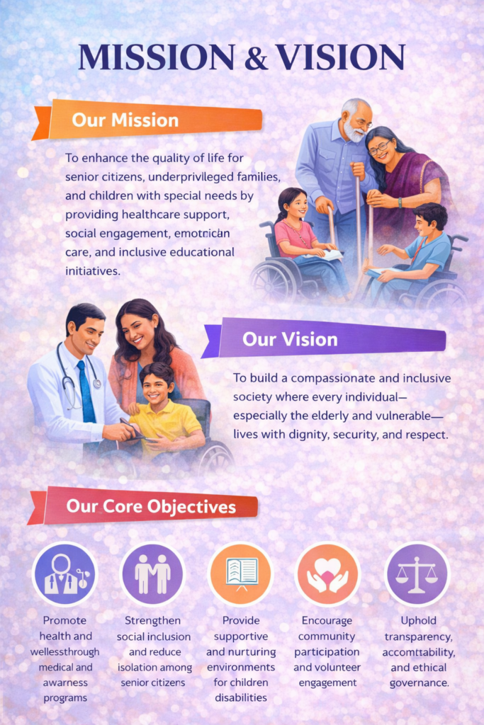 To build a compassionate, inclusive, and empowering society where every senior citizen is valued and respected. SCWA envisions a world where aging is celebrated rather than feared, and where seniors are not just cared for, but actively engaged in social, cultural, and educational life. Ensuring seniors can live with autonomy and make their own choices confidently. Promoting physical, mental, and emotional health through accessible wellness programs.